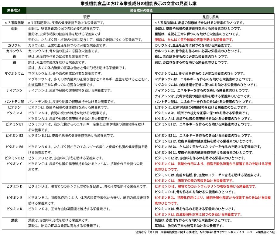 機能表示の文言の見直し原案を見ると、ビタミンCやビタミンKなど一部の栄養成分について、「日本人の食事摂取基準」を踏まえた新規の機能表示がみられる。また、機能を表示できる20種類の栄養成分のうち唯一、ビタミンAに規定されている視力に関する機能表示について、現行の「夜間の視力の維持を助ける栄養素です」を「暗所での視力を正常に保つのを助ける栄養素です」に改める案が示されている。