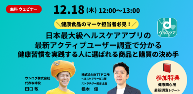 腸活マーケティング支援などを行うウンログ㈱(東京都渋谷区、田口徹社長)は12月18日、セミナー「日本最大級ヘルスケアアプリの最新アクティブユーザー調査で分かる、健康習慣を実践する人に選ばれる商品と購買の決め手」をオンラインで開催する。
