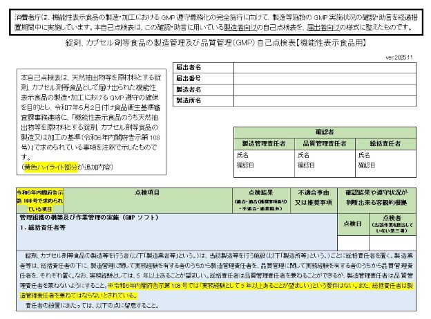 (冒頭の画像:機能性表示食品のサプリGMP自己点検表の冒頭ページ)