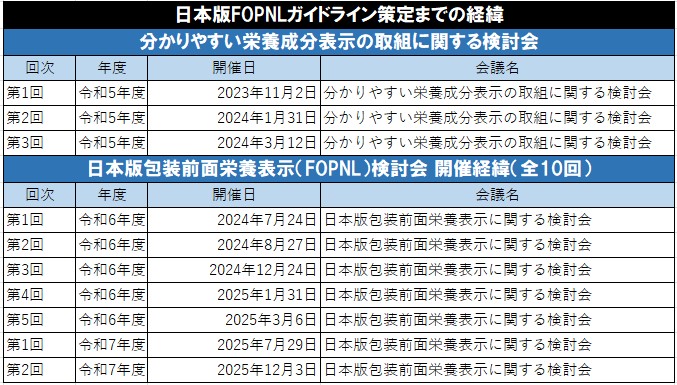 こうした基礎整理を受け、24年7月から「日本版包装前面栄養表示に関する検討会」が始動した。第1回は同24日に開催され、以降、24年度に5回、25年度に2回開催されるなど、継続的に議論が重ねられた。
