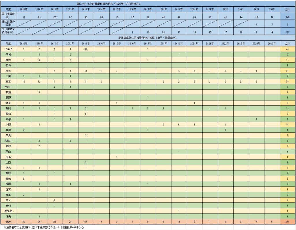 消費者庁は、12月1日~31日までの国および都道府県における景品表示法に基づく法的措置件数の推移と措置事件の概要を発表した。発表によると措置命令1件、確約計画の認定2件、課徴金納付命令1件だった。