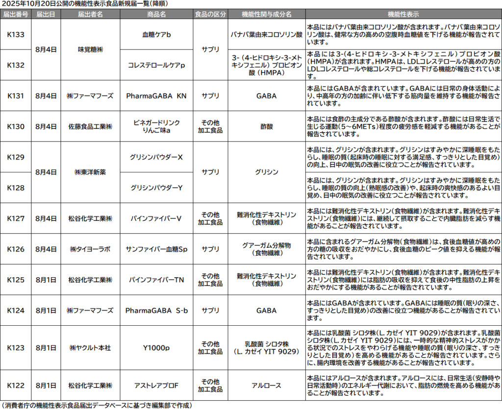 今回の更新では、新規の機能性関与成分および新たな機能性表示は見られなかった。