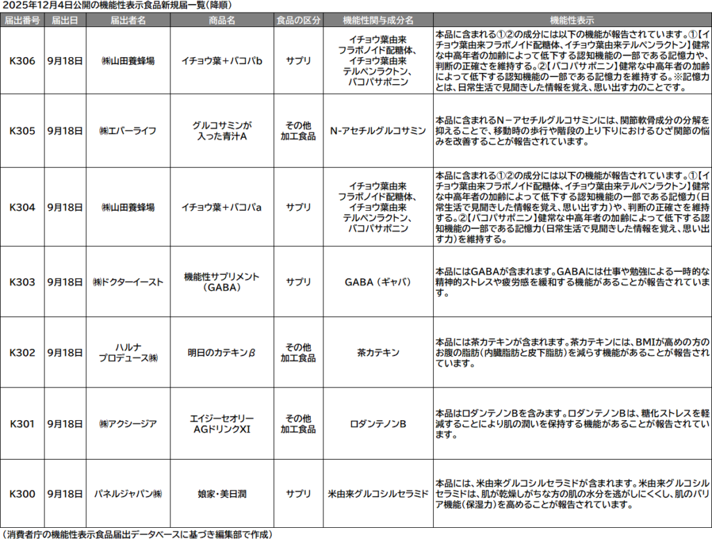 なお、この日の更新では、届出番号「K」シリーズでは初登場の機能性関与成分として、ロダンテノンBの届出が公開された。機能性表示は「糖化ストレスを軽減することにより肌の潤いを保持する機能があることが報告されています」。