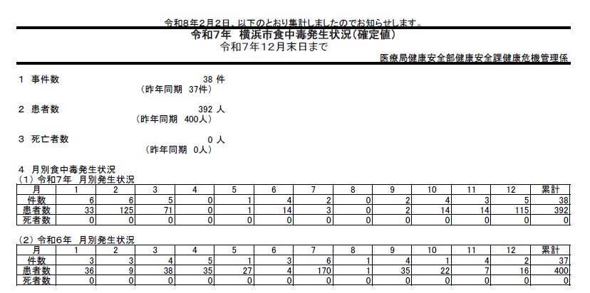 実際、横浜市が公表している食中毒発生状況の確定値を見ると、2024年(令和6年)の統計では、事件数37件、患者数400人だが、死亡者数は0人とされている。