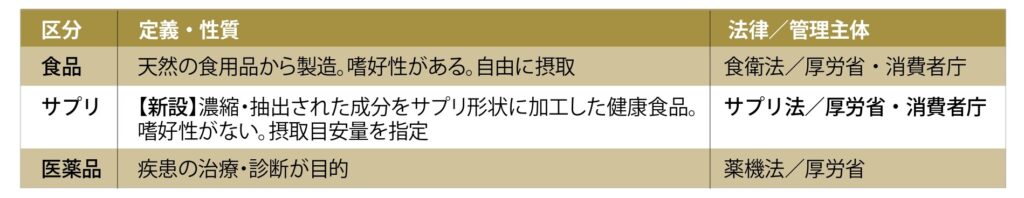 米国、EU、ASEAN等では、サプリは食品とも医薬品とも異なる独自の定義で分類されている。「提言」は、日本においても「通常の食事を補うことを目的とし、食品の一次機能または三次機能を有する成分を含むサプリ形状の製品」と定義し、食品や医薬品と法的に区別して扱うことを提案している。この再分類により、現在「食品」として流通している健康食品を、より厳格な製造・品質管理基準を求める「サプリ」に移行する。しかし、移行するのはすべての健康食品ではなく、サプリ形状の健康食品だけである。