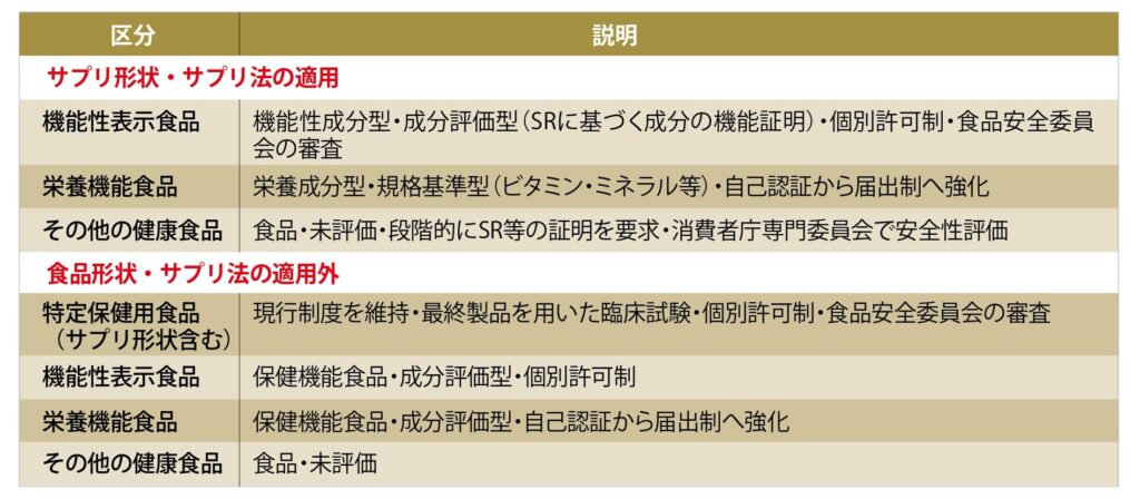 現在の市場には「特定保健用食品」、「機能性表示食品」、「栄養機能食品」、そして法的な定義のない「その他の健康食品」の4種類が混在している。「提言」は、これらを「形状」と「科学的根拠の性質」に基づいて再編している。その中核をなすのは、錠剤、カプセル、粉末などの「サプリ形状」の製品を、通常の食品とは異なる法的区分「サプリ」として独立させる「形状による区分」である。サプリ形状製品は、通常の食品と異なり、味や匂いといった二次機能(嗜好性)が排除されており、特定成分を容易に高濃度かつ多量に摂取できる特性を持つ。そのため、不純物の混入や過剰摂取のリスクが高く、同一の法規で扱うことには科学的合理性がないという理由である。ただし、トクホは製品そのものの機能性がヒト試験で証明され、安全性は食品安全委員会が審査し、公定マークによって他と明確に区別できるため、サプリ法の適用外として現行制度が維持される。サプリ形状以外の健康食品は食品の区分のままである。「提言」による再編案を整理すると、以下のようになる。