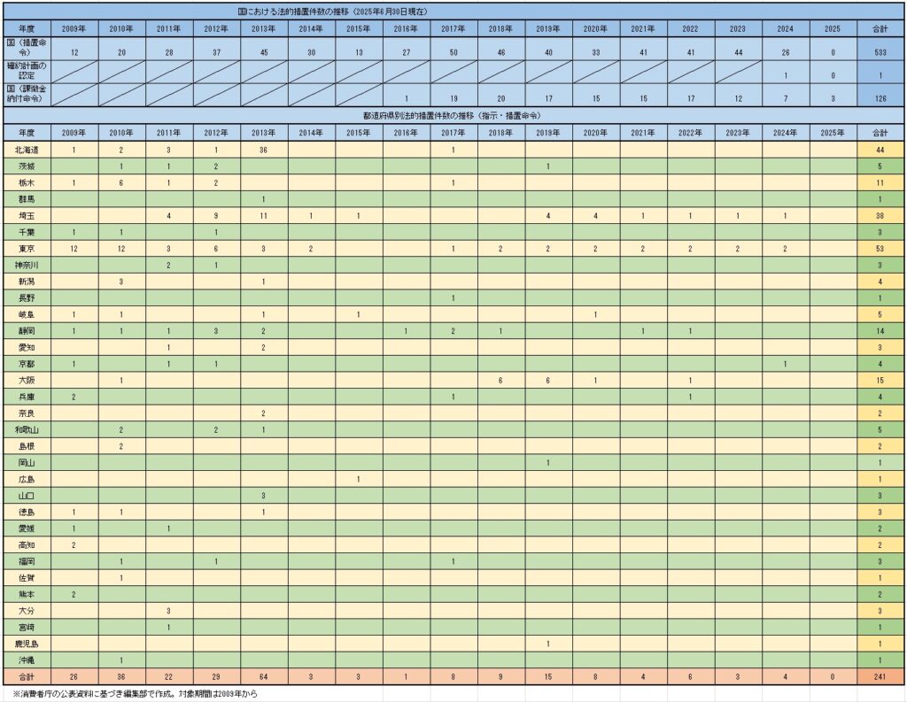 消費者庁は、6月30日までの国および都道府県における景品表示法に基づく法的措置件数の推移と措置事件の概要をきのう発表した。今年度初となる課徴金納付命令が3件だった。