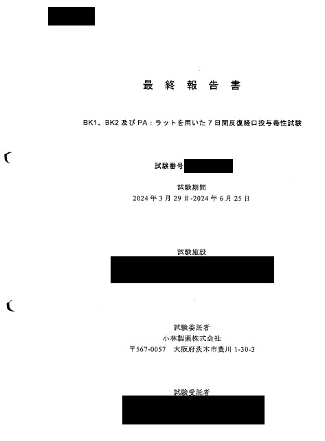 筆者が今月9日、厚労省に対して行った取材では、「プベルル酸に関する7日間の毒性試験は、小林製薬が提供したデータを利用した」との説明を得ている。つまり、事件の加害企業である小林製薬が提出した試験データに基づき、プベルル酸の毒性が評価されたということである。少なくとも昨年11月5日に行った情報開示請求によって入手した資料には、試験委託者が小林製薬であるとの記載はあったものの、実施主体は黒塗りにされていたために分からなかった。しかし今回、小林製薬が主体となって実施した試験であることが明らかになったわけである。しかもこのマスキングは、小林製薬自身が行ったものらしい。