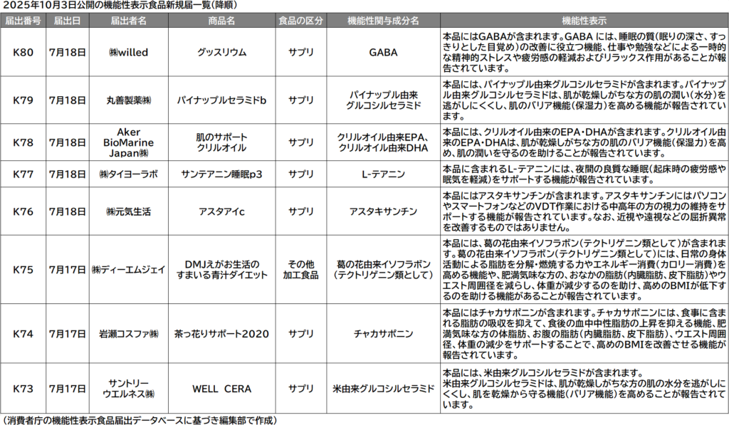 この日の更新では、他に2025年度の届出番号「K」シリーズとしては初の機能性関与成分として、L-テアニン、チャカサポニンの届出がそれぞれ公開された。