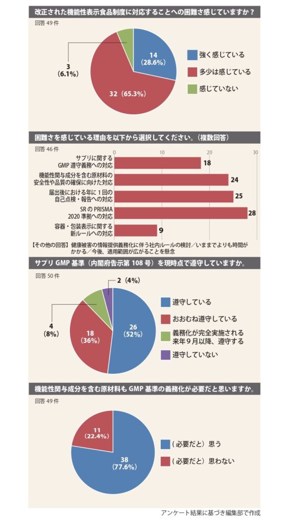 改正された制度のどこに困難さを感じているのか。それを選択形式の複数回答で尋ねる設問で最も多く選択されたのは「システマティックレビュー(SR)のPRISMA2020準拠への対応」(28件)。次いで、「届出後における年に1回の自己点検・報告(届出更新制)への対応」(25件)、「機能性関与成分を含む原材料の安全性や品質の確保に向けた対応」(24件)、「天然抽出物等を原材料とする錠剤、カプセル剤等食品(サプリ)に関するGMP遵守義務への対応」(18件)が続いた。
