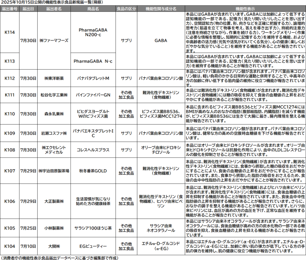 このほか、オリーブ由来ヒドロキシチロソールを機能性関与成分として配合したサプリメントの届出も公開された。同成分の届出公開は、2025年度の届出番号「K」シリーズとしては今回が初めて。