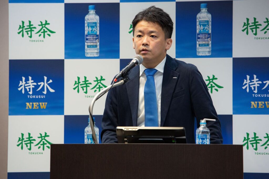 発売を前に同社は14日、都内で「ブランド戦略説明 新商品発表会」を開催。同社SBFジャパン、ブランドマーケティング本部、課長の野口裕貴氏(=下の写真)は、「特茶のブランドビジョンは、健康への意欲を持つ全ての人の伴走者になること。そのビジョンのため、これまで、エビデンスの進化とラインアップの拡張を推し進めてきた。これまで、お茶のブランドとして商品を展開してきたが、今回、より一層多くの人に伴走するため、お茶の枠を超え、そして特茶と並び立つような存在を目指し、新商品を発売する」と説明した。