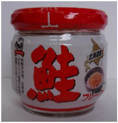 調査によると、同社は『北海道産ハッピーフーズ鮭フレーク』(=写真)など一般用14品目、業務用1品目の計15品目において、鮭(白鮭・秋鮭を含む)とカラフトマスを混合して使用していたにもかかわらず、原材料名にカラフトマスを表示していなかった。さらに、カラフトマスが最も高い割合を占める製品においても、「国産」や「北海道産」といった原料原産地名を記載せず販売していた。