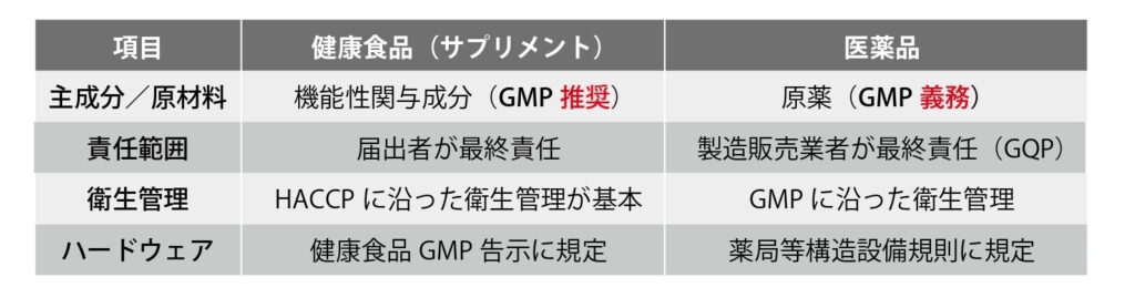 大きな違いは、上の表に示すとおり、製品の有効性・機能性を担う主成分(機能性関与成分/原薬)に対するGMP適用の扱いです。医薬品では、有効成分である原薬の製造段階からGMPが義務付けられていますが、健康食品では、機能性関与成分の製造は現時点では推奨にとどまっています。