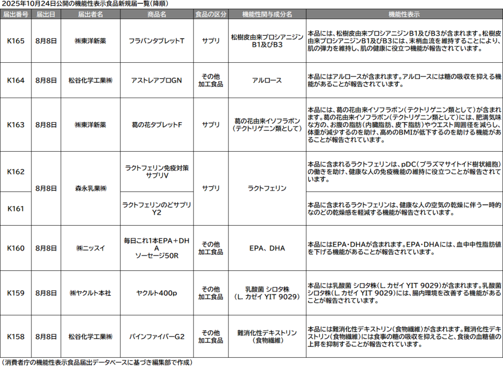消費者庁は28日、機能性表示食品の届出データベース情報を更新した。新たに8件の新規届出情報を公開し、今年度(2025年度)の届出番号「K」シリーズの公開件数は累計165件となった。10月のデータベース更新は、これで9回目。25年度分の公開を始めた7月以降では最多を数えた。