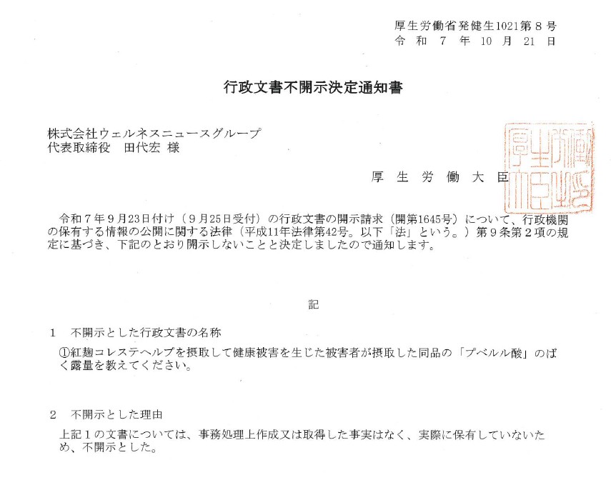 筆者が厚労省に対して行政文書の開示請求を申請したことは、「まだまだ続く? 紅麹サプリ事件」で書いた。同じ開示請求書において、「紅麹コレステヘルプを摂取して健康被害を生じた被害者が摂取した同品の『プベルル酸』のばく露量」について情報開示を求めたが、「文書が不在」ということで不開示通知が届いた(=下の写真)。このことは、健康被害をもたらした小林製薬製『紅麹コレステヘルプ』の錠剤を基にした検証試験が実施されていない可能性を示唆させる。