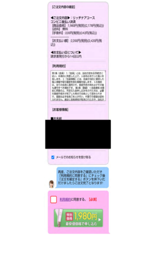 しかし、同広告から自動的に遷移する同品のチャットボットページから申し込むことができる「リッチケアコース」という定期購入契約の内容は、実際には、2回目以降のお届け予定日の15日前の期限までに所定の方法に従った解除の連絡をしなければ、2回目以降の商品(1回当たり同品3本)の金額(税込1万9,965円)の支払いを義務付けられ続ける無期限の定期購入だった。さらに、2回目の商品を購入せずに解除する場合には、「差額分」という名の解約料を求めて税込1万1,055円の支払いが義務付けられるなどの契約上の制約が課せられるというものだった。そのため、契約者は2回分の合計(同品4本)の金額として合計2万2,143円を支払うか、同品を初回の1回のみ購入するには合計1万1,055円を最低でも支払うこととされており、1,980円(税込2,178円)のみを支払うことによって同品1本を購入することはできないというものだった。