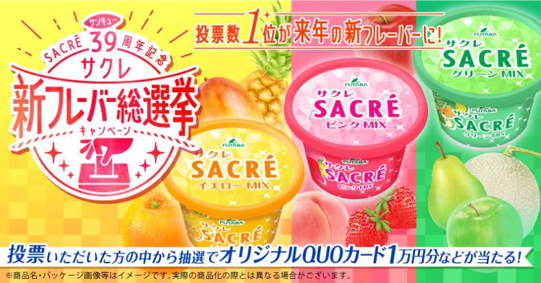(昨年の「サクレ新フレーバー総選挙」で最多投票数を集めて1位となった『サクレ ピンクミックス』(=上の写真(左))(現在は終売)と、その投票を呼び掛けるデジタルフライヤー。投票者の中から抽選で1万円分のQUOカードなどが当たる懸賞付きで実施した。