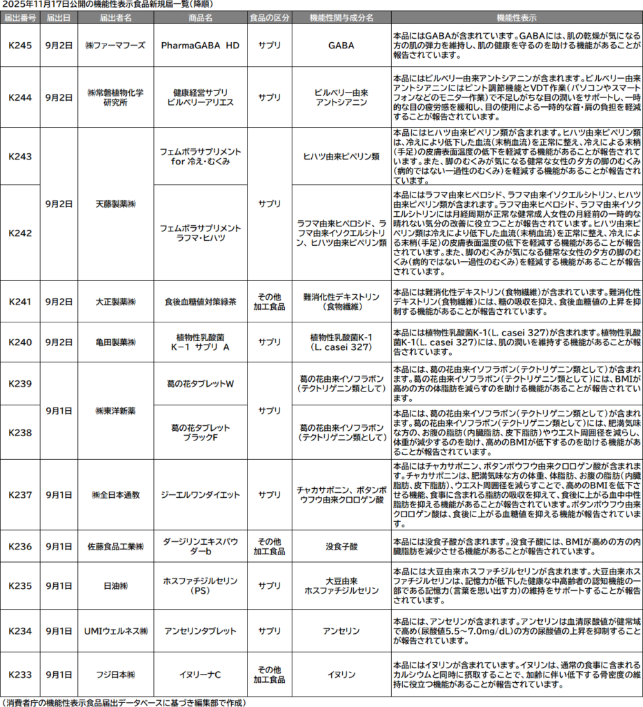 :【6日】11月最初の更新、34件一挙公開 今年度初登場の機能性関与成分も多く
