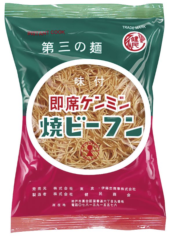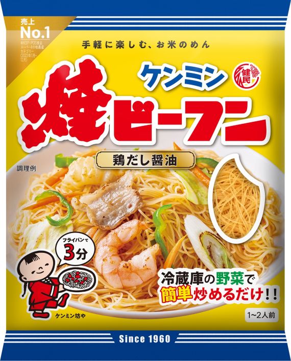 (下の写真『ケンミン焼ビーフン』の発売当時(左)現行品。65周年記念キャンペーンではOisixとのコラボレーションによって、厳選旬野菜と『ケンミン焼ビーフン鶏だし醤油』3袋が抽選で当たるレシートキャンペーンを実施。第4弾として2026年1月31日まで応募を受け付けている)