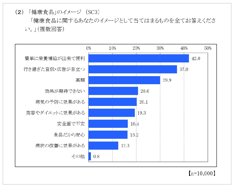 (冒頭の画像:調査報告書から抜粋。健康食品のイメージを尋ねた設問結果。複数回答で3割超が「行き過ぎた広告・宣伝が目立つ」と回答。「病状の改善に効果がある」も1割超に)