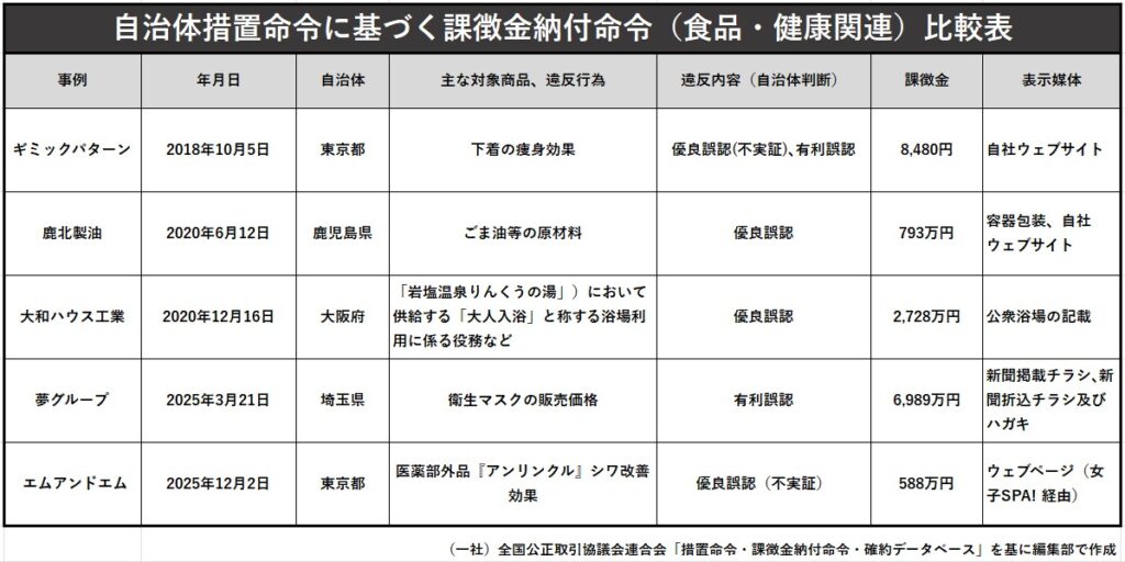同社には過去にも複数の商品で処分や申入れが繰り返されており、医薬部外品に対する課徴金命令は制度開始後初のケースとなる。また、地方自治体の措置命令に基づく課徴金納付命令としても食品、ヘルスケア関連分野では2016年4月以降、5件目という珍しい記録となった。