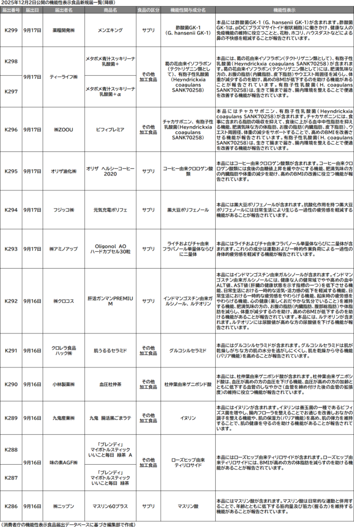 機能性表示食品の届出データベース情報が2日連続で更新された。消費者庁は1日に続いて2日にも更新を実施。計14件の新規届出に対して届出番号を付与し、情報を公開した。小林製薬㈱(大阪市中央区)などからの届出が含まれる。また、2025年度の届出番号「K」シリーズとしては初公開となる機能性関与成分も目立った。