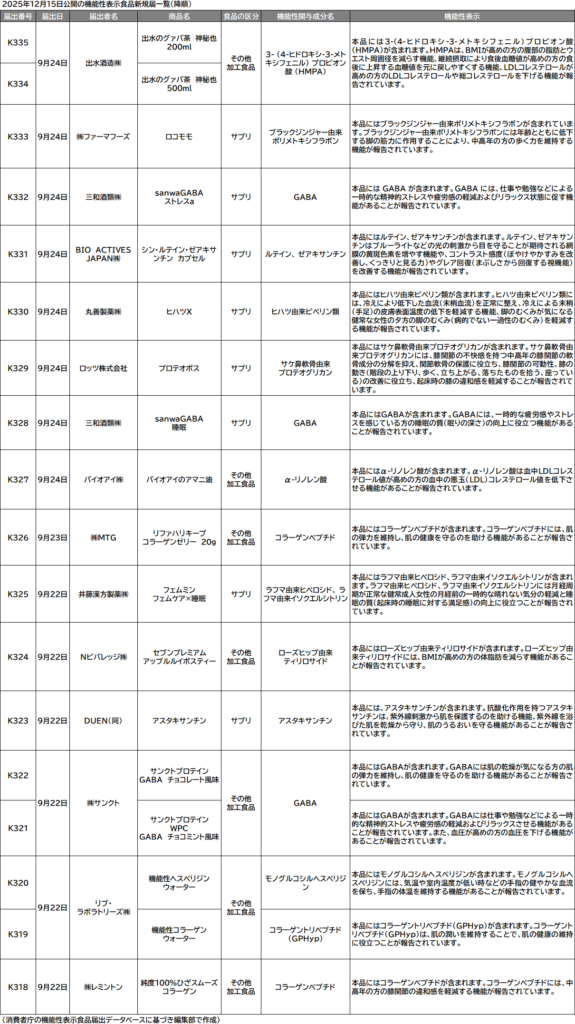 消費者庁は15日、機能性表示食品の届出データベース情報を更新した。新たに18件(サプリメント8件、サプリ以外の加工食品10件、生鮮食品0件)に対して届出番号を付与して公開。2025年4月1日以降では初の届出公開となる機能性関与成分には、サケ鼻軟骨由来プロテオグリカンをはじめ、α-リノレン酸、モノグルコシルヘスペリジン、コラーゲントリペプチド (GPHyp)があった。