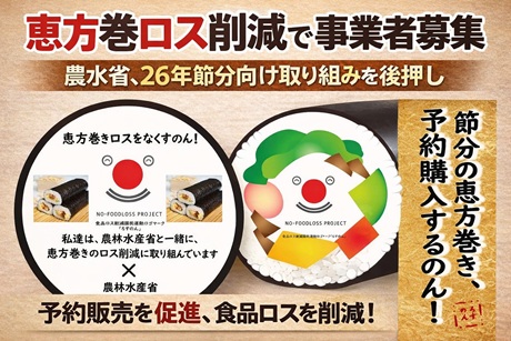 同省は、来年の節分の日に向け、恵方巻きの廃棄削減に主体的に取り組む食品小売事業者を募集し、応募した事業者名および取組内容を農林水産省ホームページ上で公表する。公表は26年1月下旬を予定している。