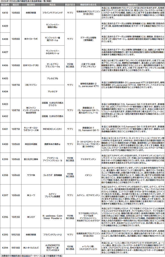 機能性表示食品の届出情報データベース(DB)が5日、更新された。2026年初の更新で消費者庁は、計17件(サプリメント11件、サプリ以外の加工食品6件、生鮮食品0件)の新規届出に届出番号を付与・公開した。これで2025年度の届出番号「K」シリーズは累計410件となり、ようやく400件を突破。一方、この日の更新では、計87件に上る撤回届出が新たに積み上がっており、既存届出の撤回が新規届出の公開を上回る勢いが加速している。これらの撤回届出は昨年12月11日から同23日までのおよそ2週間で行われたもの。