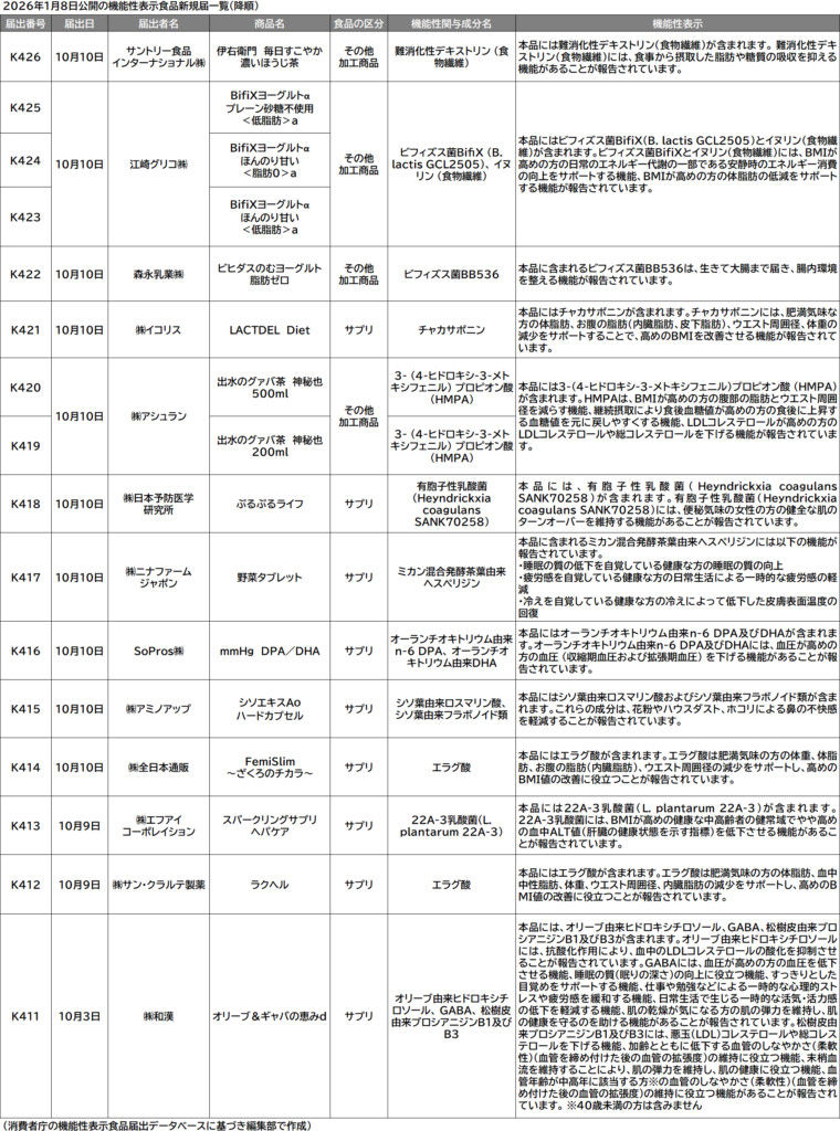 機能表示食品の届出情報データベースの更新が8日にあり、消費者庁は新たに計16件(サプリメント9件、サプリ以外の加工食品7件、生鮮食品0件)の新規届出を公開した。撤回届出も増加。先月24日から今月5日までの間に、計57件の既存届出が自主的に取り下げられた。