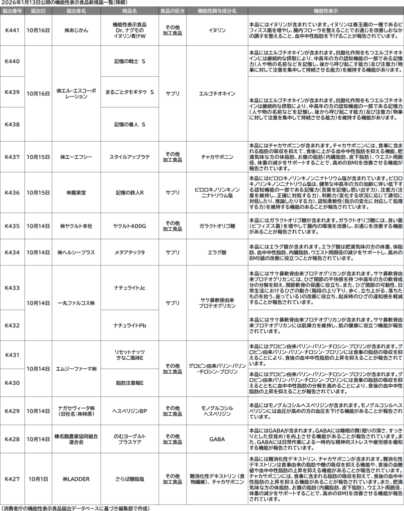 これで「K」シリーズの届出番号付与・公開件数は累計441件となった。健康被害事案を受けて見直された機能性表示食品制度が2025年4月に全面的に施行された影響を受け、例年と比べて顕著に少ない。この日のDB更新で、同年10月1日以降に消費者庁へ届け出られた新規届出の公開が始まった。