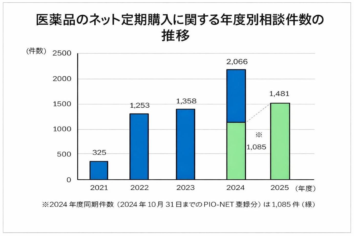 国センが昨年8月公表した2024年度の「消費生活相談の状況」によると、定期購入に関する相談件数は、ネット通販での健康食品や化粧品を中心に9万4,178件だった。このため、医薬品に関する相談件数は一握りに過ぎない。また、国センの相談情報部は、「重大な被害を伴う相談は寄せられていない状況だ」と説明している。