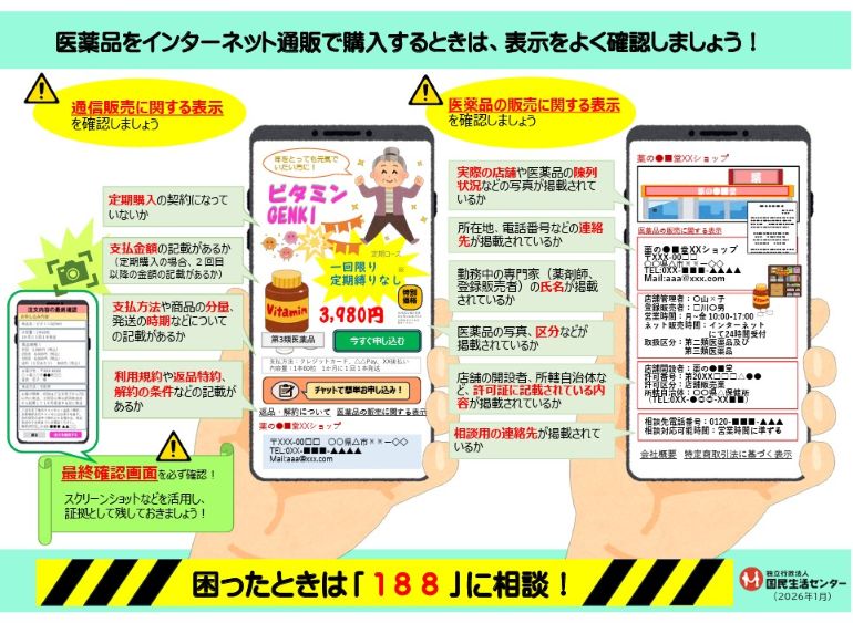 一般用医薬品をインターネット上で販売できるのは、医薬品医療機器等法(薬機法)に基づく許可を受けた事業者のみで、販売サイトに表示しなければならない事項が同法で定められている。また、健康食品や化粧品などのネット通販と同様に特定商取引法に基づく表示規制を受ける。定期購入に関するトラブル相談が寄せられた商品の販売サイトを相談情報部が調べたところ、「明らかに違法だと思われるものはわれわれが調べた範囲では見当たらなかった」