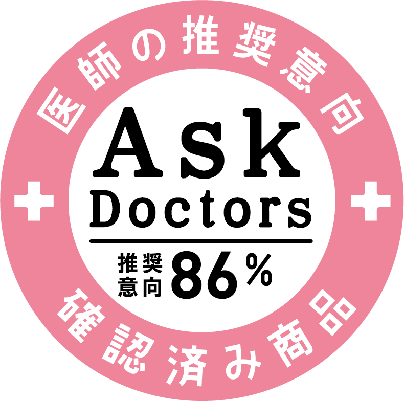 評価プロセスは非常に厳格です。商品の特性に合わせて、内科や整形外科など適切な診療科の医師を最低100人選定します。医師には成分やエビデンスの資料を提示し、可能な限り実サンプルも試用していただきます。その結果、75%以上の医師が「他の人に勧めたい」と回答した場合にのみ、AskDoctors認定マーク(下の写真)が付与されるという仕組みです。