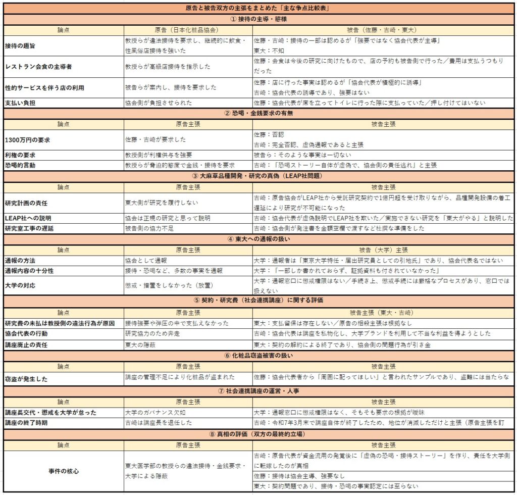 東京地裁において、(一社)日本化粧品協会(JCA、東京都文京区、引地功一代表理事)および(一社)日本中小企業団体連盟(東京都中央区、中村賢吾理事長)が、東京大学ならびに佐藤伸一教授、吉崎歩元准教授を被告として提起した訴訟の第2回準備手続が、12月26日に行われた。これに先立ち原告側は請求の一部を取り下げたが、主張の後退ではなく争点整理のための技術的対応と説明している。準備手続では、相殺の成否や契約解除の妥当性を中心に、双方の主張が鋭く対立した。裁判記録を閲覧の上、記者が把握した範囲において経過を報告する。