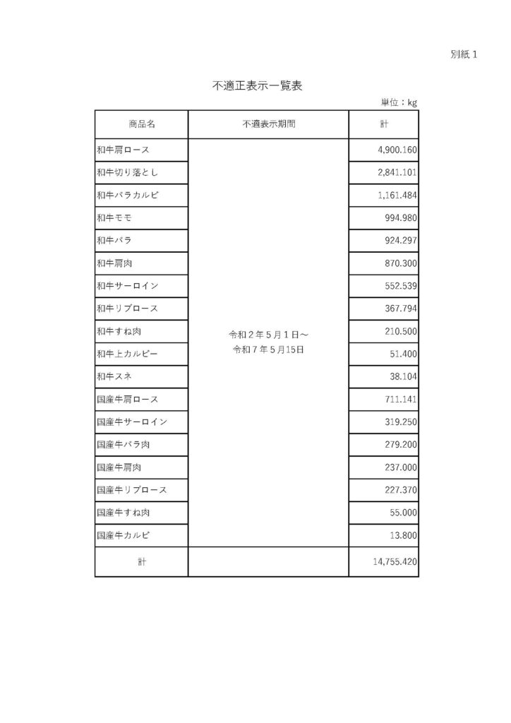 北海道農政事務所が牛トレーサビリティ法第19条第3項に基づき、2025年5月15日~12月11日までの間、石堂精肉店に対する立入検査等を実施したところ、同店が特定牛肉について個体識別番号を表示しないまま、少なくとも20年5月1日~25年5月15日までの間に、合計1,475万5.420kgを一般消費者に販売していたことを確認した。