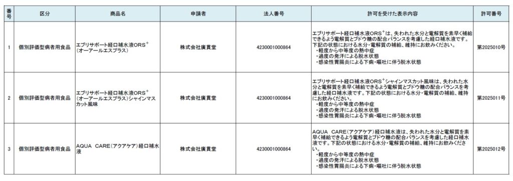 許可を受けたのは、㈱廣貫堂(富山市梅沢町)の3商品で、『エブリサポート経口補水液ORS+(オーアールエスプラス)』(第2025010号)、『エブリサポート経口補水液ORS+(オーアールエスプラス)』シャインマスカット風味』(第2025011号)、『AQUA CARE(アクアケア)経口補水液』(第2025012号)の3品。