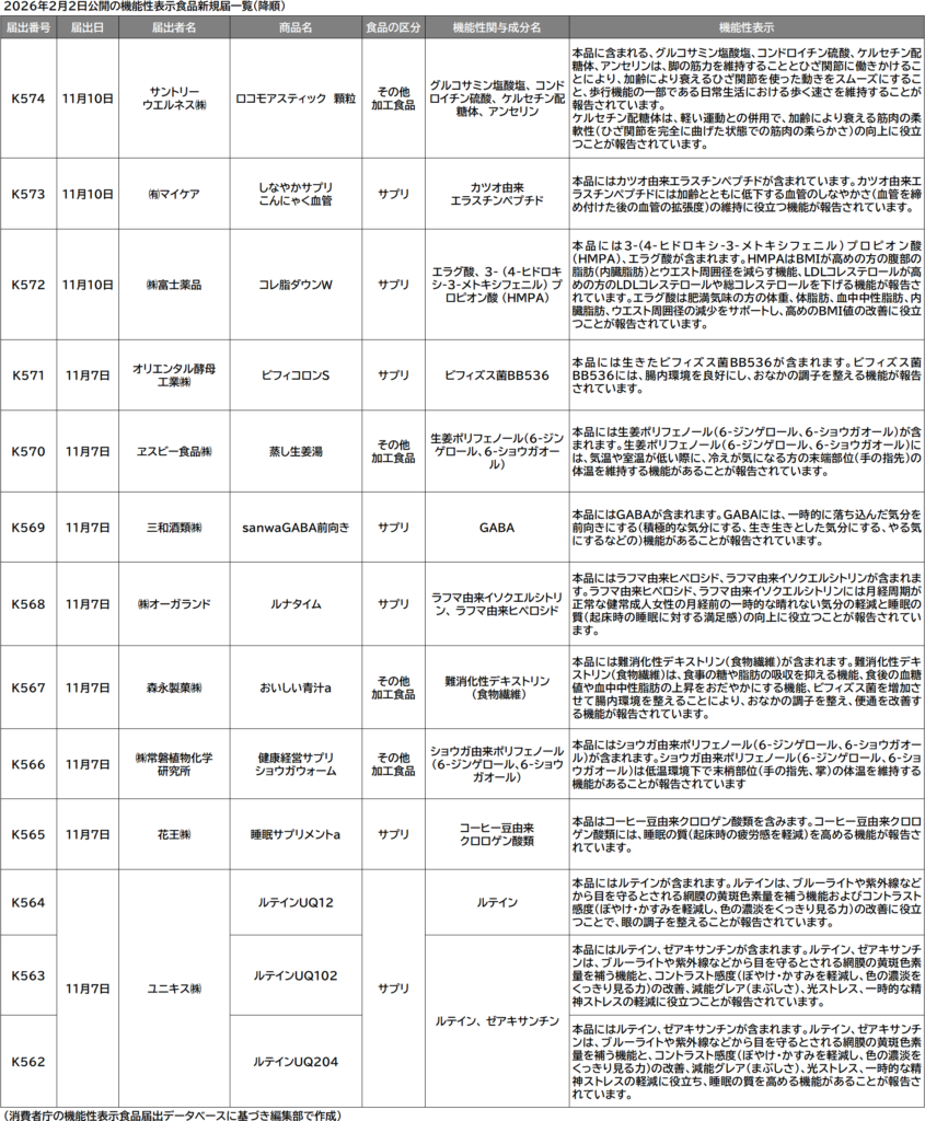 消費者庁は2日、機能性表示食品の届出情報検索データベース(DB)を更新した。2月最初の更新で同庁は、新規届出13件(いわゆるサプリメント9件、サプリ以外の加工食品4件、生鮮食品0件)に届出番号を付与して公開。花王㈱(東京都中央区)やサントリーウエルネス㈱(東京都港区)などからの新規届出が含まれていた。