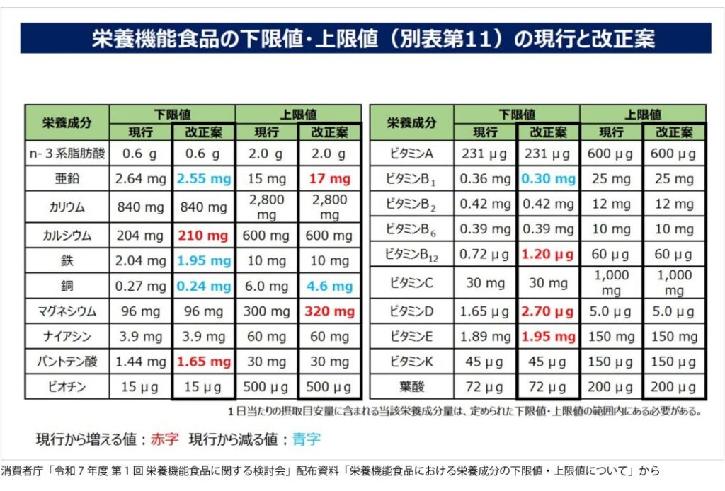 消費者庁は、①と②について、栄養機能食品制度の土台となる「日本人の食事摂取基準」(2025年版)、それに基づく「栄養素等表示基準値」のほか、前述の調査事業の成果を踏まえた改正案を用意して検討会に臨んだ。そして検討会はそれぞれの改正案を概ね了承。②の下限値・上限値の改正案は以下のように整理された。