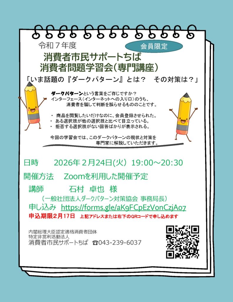 適格消費者団体(特非)消費者市民サポートちば(サポちば、千葉市中央区、拝師徳彦理事長)は、消費者問題学習会(専門講座)として、「いま話題の『ダークパターン』とは? その対策は?」を開催する。