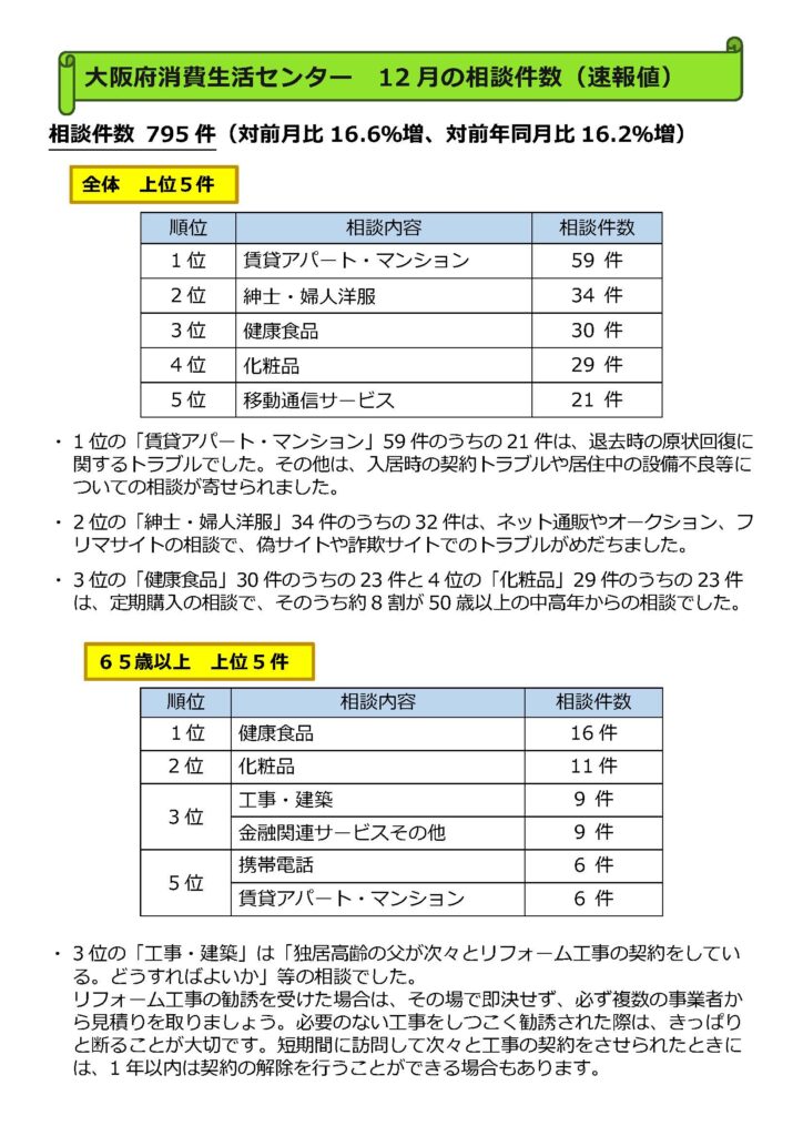 大阪府消費生活センターは、12月に受け付けた消費生活相談件数(速報値)を公表した。12月の相談件数は795件で、前月比16.6%増、前年同月比16.2%増となった。