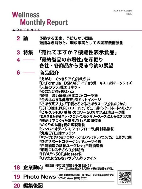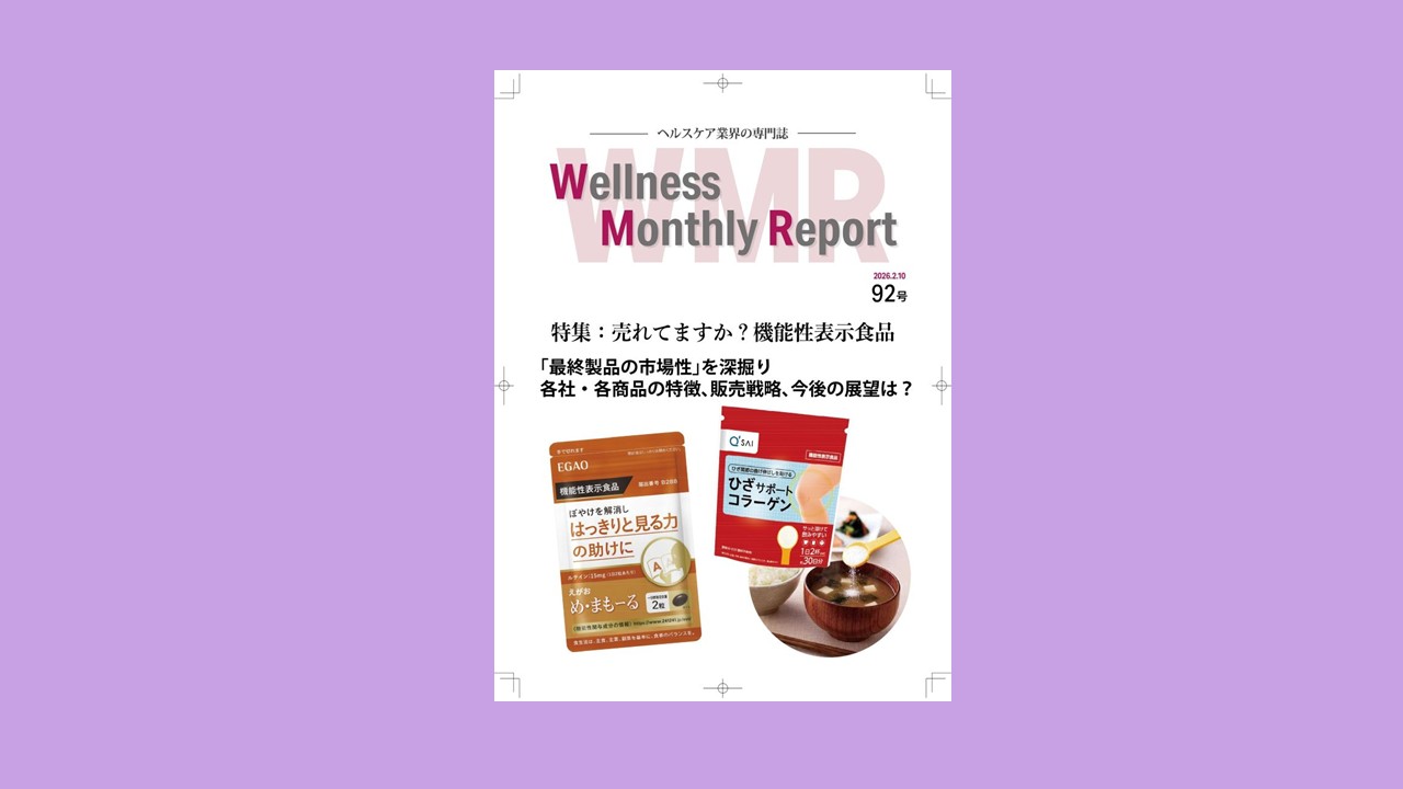 ㈱ウェルネスニュースグループ(WNG)はきょう10日、ヘルスケア産業の専門誌『Wellness Monthly Report』の最新号、2026年2月号(第92号)の電子版を発行した 。今号では「売れてますか?機能性表示食品」と題し、転換点を迎えたヘルスケア市場における機能性表示食品の市場性を深掘りした。