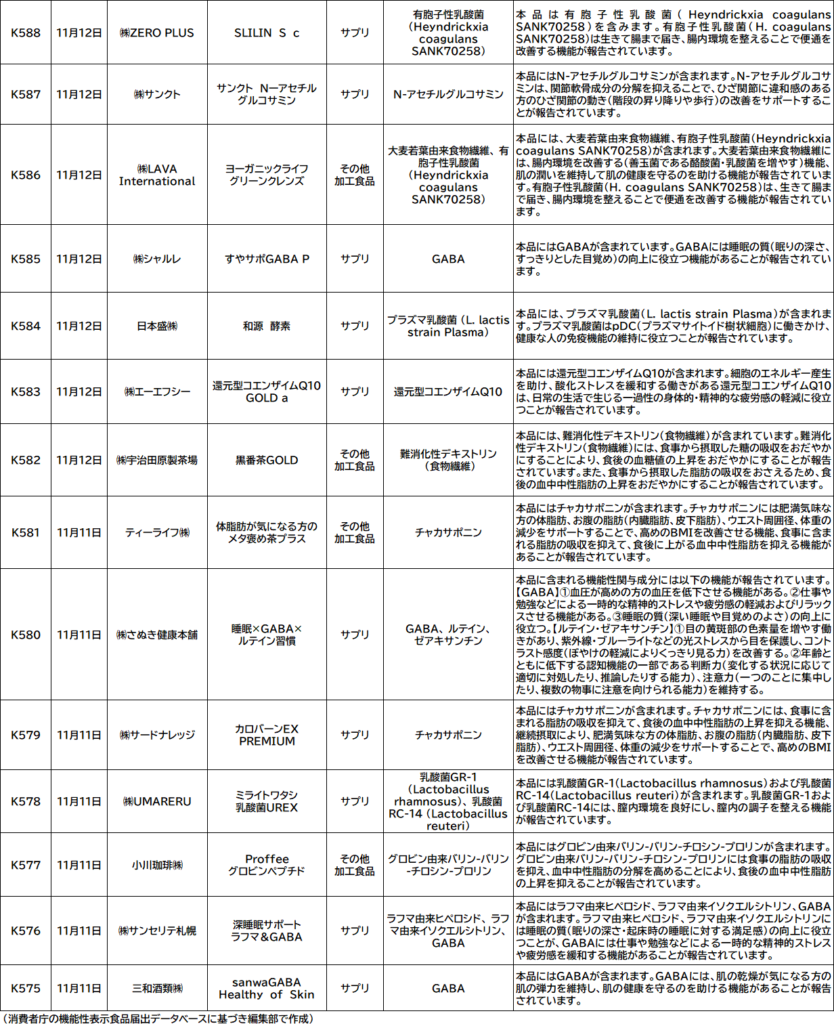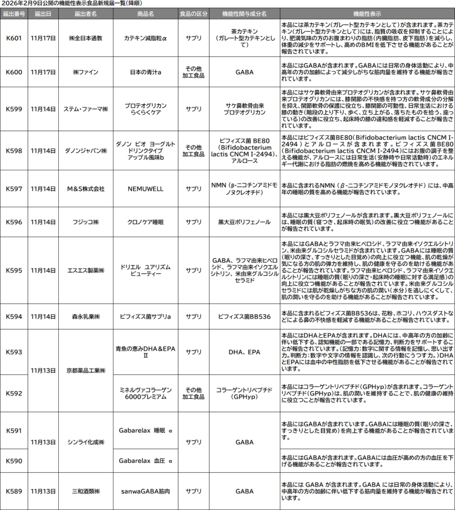 消費者庁は9日、機能性表示食品の届出情報検索データベース(DB)を更新した。新たに27件(サプリメント形状20件、サプリ形状以外の加工食品7件、生鮮食品0件)に届出番号を付与・公開した。これで2025年度の届出番号「K」シリーズの件数は累計600件を超えて601件となった。現在、昨年11月中旬までに同庁へ提出された新規届出の公開が進んでいる。