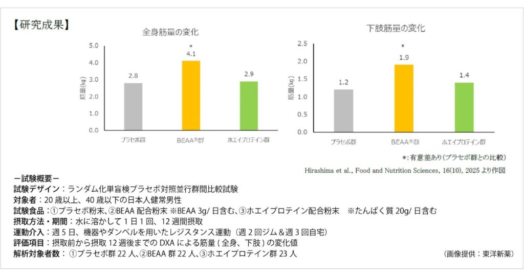 同社が行ったヒト試験は、ランダム化単盲検プラセボ対照並行群間比較試験。20歳以上40歳以下の日本人健常男性を3群に分け、①プラセボ3g、②BEAA3g、③ホエイプロテイン20gを週5日のレジスタンス運動とともに1日1回、12週間摂取。その結果、BEAA3g摂取群は、プラセボ3g摂取群と比較して、全身と下肢の筋量に関連する評価指標に有意な増加が確認され、ホエイプロテイン20g摂取群との比較で同等以上であったという。この結果を踏まえ、同社はBEAAを、「3gでホエイプロテイン20g相当の運動によるカラダづくりをサポートする次世代アミノ酸」として打ち出すことにした。