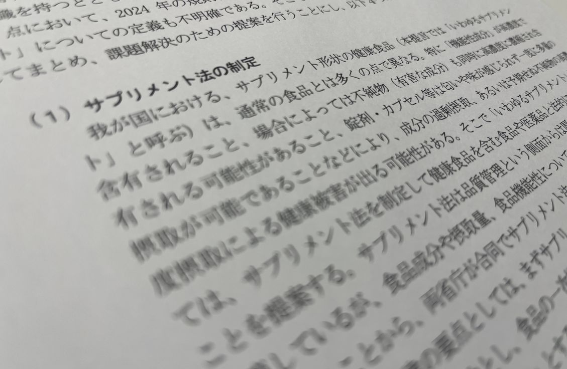 法制定に関する提言では、サプリメントは「通常の食品とは多くの点で異なる」と指摘。「成分の過剰摂取、あるいは予期せぬ不純物の高濃度摂取による健康被害が出る可能性がある」。そこで現状では存在しないサプリメントの法律上の定義を定め、サプリメント法を制定し、「健康食品を含む食品や医薬品と法的に区別して扱う」ことを提案。厚労省と消費者庁が合同で法制定に取り組むことが「望ましい」とした。