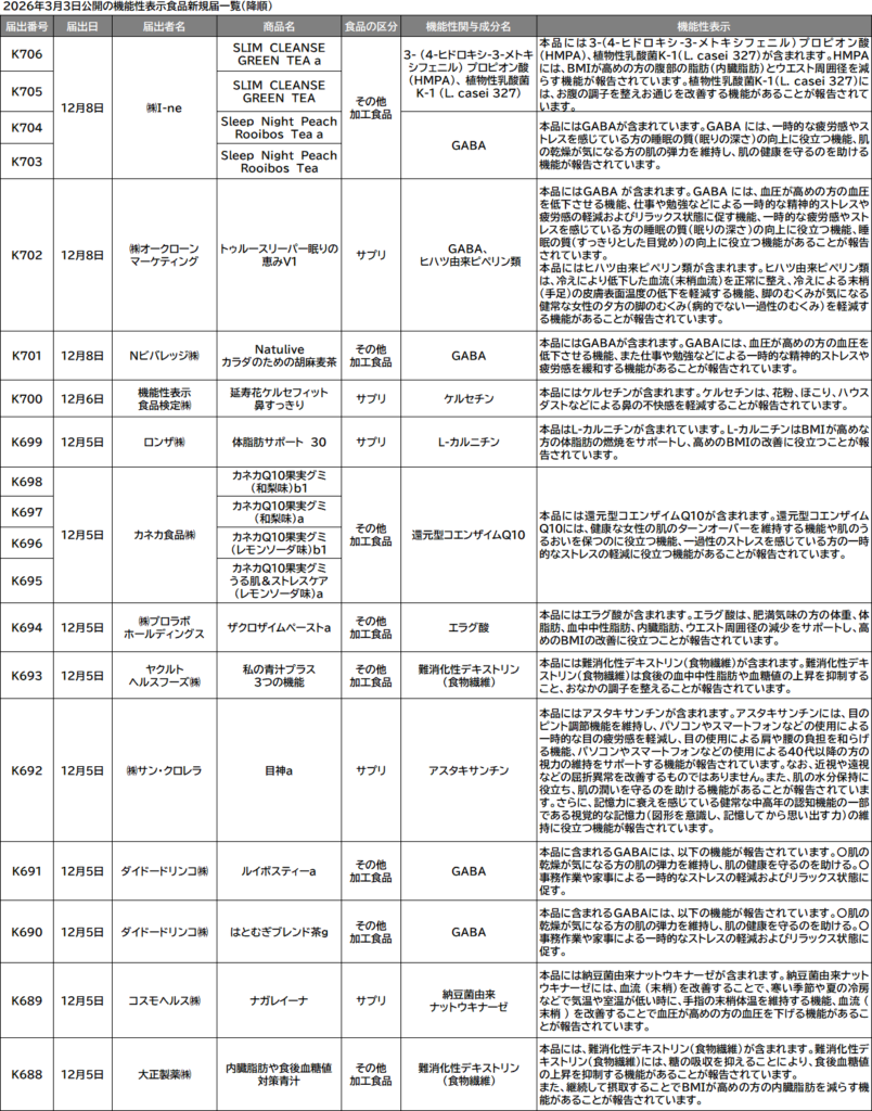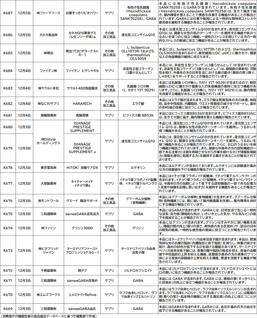 消費者庁は、今月に入って初となる3日のDB更新で計38件(サプリメント形状18件、サプリ形状以外の加工食品20件、生鮮食品0件)に届出番号を付与して公開した。これで2025年の届出番号「K」シリーズの公開件数は累計700件を超え、706件となった。撤回届出も大幅に増加。先月19日から同25日までの間に新たに47件の既存届出が取り下げられた。