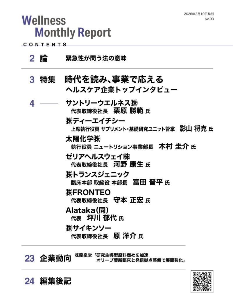 ㈱ウェルネスニュースグループ(東京都港区)はきょう10日、サプリメントや健康食品などのヘルスケア産業専門誌『ウェルネスマンスリーレポート』(WMR)の2026年3月号(第93号)のオンライン版を発刊した。特集は、「時代を読み、事業で応える」。サプリメントをはじめとするヘルスケア企業のトップら8人のロングインタビューをお届けする。