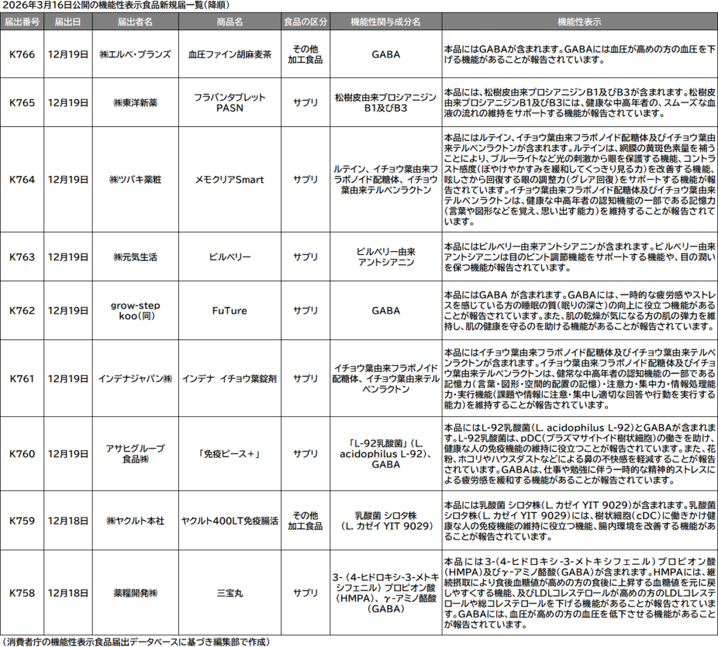 消費者庁は16日、機能性表示食品の届出情報検索データベース(DB)を更新し、「健康な中高年者の、スムーズな血液の流れの維持をサポートする機能が報告されています」という、過去に届出実績のない機能性表示を公開した。機能性関与成分について、健常成人の血小板凝集能に及ぼす影響を検証したシステマティックレビュー(SR)を科学的根拠とするもので、いわゆる「血液サラサラ」機能を、機能性表示食品に認められる健康維持・増進の範囲に収まる表現に落とし込んだかたちだ。機能性関与成分は松樹皮由来プロシアニジンB1及びB3で、届出者は㈱東洋新薬(本部:佐賀県鳥栖市)。