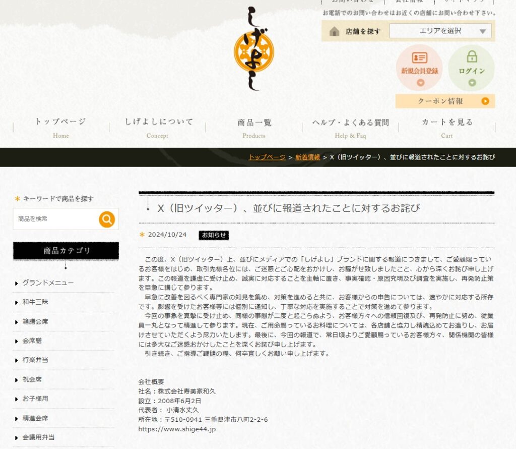 次に、㈱寿美家和久である。同社は三重県津市に本店を置く法人で、一定期間にわたり事業を展開してきた経緯を持つ。過去には同社代表が「しげよし」が起こしたトラブルについて謝罪コメントを公表していることから、宅配事業との関係が推察される。登記上の事業目的には飲食関連事業が含まれており、弁当事業との関連性を否定するものではない。